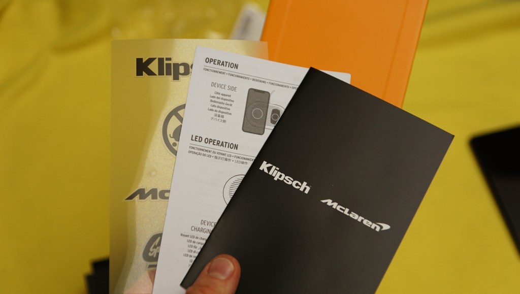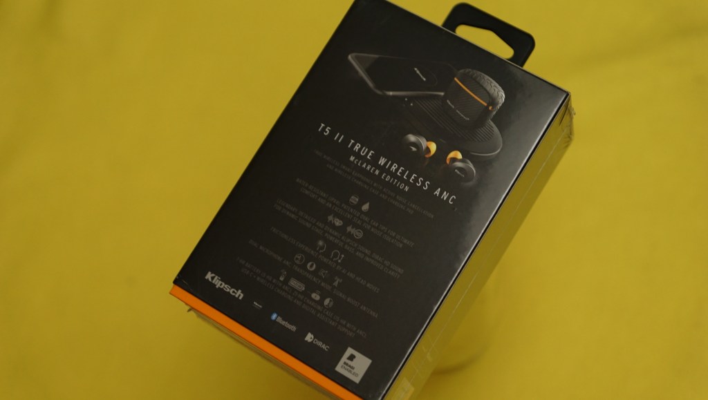 Der berühmte erste Eindruck, fällt durch die schwere und auch reichlich gefüllte Verpackung doch gut aus. Bis man dann letztendlich bei den In-Ears angelangt ist. Klipsch versucht den Prozess des Auspackens so lange wie möglich hinauszuzögern und man wird förmlich von Beschreibungen und Aufklebern hingehalten. Hat man sich nun durch gekämpft und ist bei dem Ladecase und den In-Ears angelangt glaubt man seinen Augen kaum. Gut das Design ist bemerkenswert und auch sehr auffallend. Die Textur des Cases soll auf Carbon-Verarbeitung hindeuten, ist aber bei näherer Betrachtung nur eine Folie die an den Ecken sich bereits leicht löst. Gut gefallen hat mir das Reifenprofil welches zwar schick aussieht und natrülich dem ganzen Thema entspricht aber leider auch ein extremer Fussel-Magnet zu sein scheint. Denn zwei, dreimal in der Hosentasche verstaut hat das Case beim Herausnehmen einen doch sehr starken Pelz vorzuweisen. Gut genug vom Case der linke In-Ear hat ein kleines Klipsch-Logo der rechte das kleine McLaren Logo aufgedruckt. Die In-Ears verfügen über keine Touch-Eingabe sondern die Tasten sind physischer Natur. Erzeugt beim Drücken ein unangenehmes Gefühl auf dem Ohr. Außerdem verfügen die In-Ears über kein Sensor der wahrnimmt ob die Ohrhörer im Ohr stecken oder nicht. Wiedergabe wird nur gestoppt wenn die Ohrhörer im Case verstaut werden.