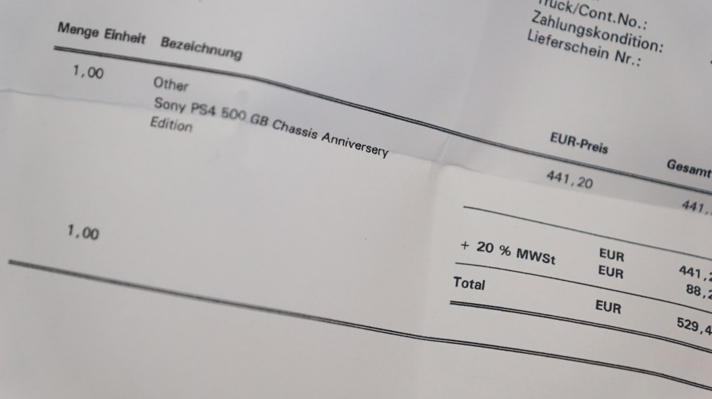 | 91 | SONY | SONY PS4 20th Anniversary | Sony PS4 in OVP sealed sehr guter Zustand mit Überkarton und original Rechnung von Alba Trade einem Distributor von Sony | JA | JA | 10 | 10 | 1500 |