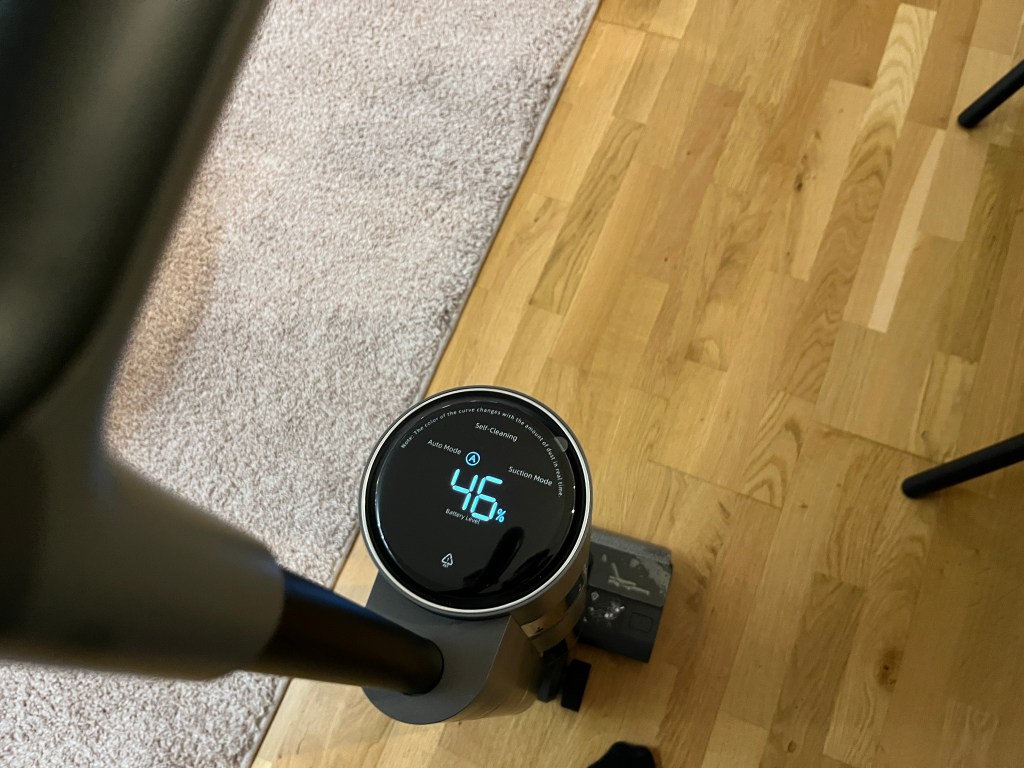 Der H12 lässt sich problemlos führen und durch die Vorwärtsbewegung der Walzenbürste muss kaum nach Vorne geschoben werden. Hochheben geht mit einer Hand schwer. Der Handgriff ist für meine Größe optimal, aber er ist nicht Höhen verstellbar. Sehr kleine oder sehr große Personen können hier vielleicht Probleme haben. Gut gefallen hat mir der LED-Ring um das etwa 4Zoll große Display. Je nach Verschmutzung des Bodens, passt sich die Saugleistung als auch die Farbe des Ringes an. Er leuchtet grün, orange oder rot.