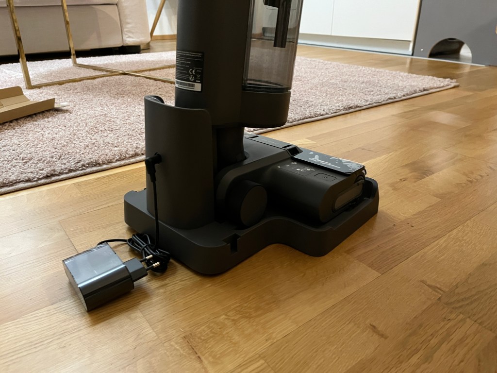 Ein großer Kritikpunkt den ich gleich zu Beginn bemerkt habe ist die einseitige Bürste die nur auf der linken Seite ganz bis zum Sockel heran kommt. Um den Sockelbereich zu reinigen muss man immer von rechts nach links gehen. Reinigt man den Bereich von der anderen Seite ist die Bürste etwa 4 cm entfernt. Das muss man immer im Auge behalten. Wenn ich mich flott bewege schaffe ich es unsere 80m² große Wohnung wo dann effektiv etwa 60m² zu reinigen sind mit einer Akkuladung. Der Akku haltet etwa 30 Minuten und muss dann in die Ladestation. Dort präsentiert er sich schön wobei er auch viel Platz einnimmt und ein Netzanschluss muss auch vorhanden sein.